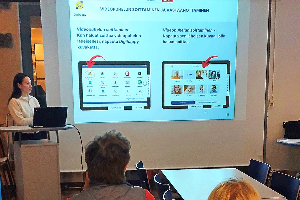 Digihappyn edustajat Tiina Leino ja Johanna Yoshimura toivat tullessaan uuden joulun, kun senioritabletit luovutettiin asiakkaille. Mukavassa tilaisuudessa kohtasivat läheiset, asiakkaat, omaishoitajat ja eläkeyhdistysten Hyve-kaverit, jotka toimivat ikääntyneiden apureina etäohjausten alkaessa ma 19.1.2026 ja sen jälkeen.