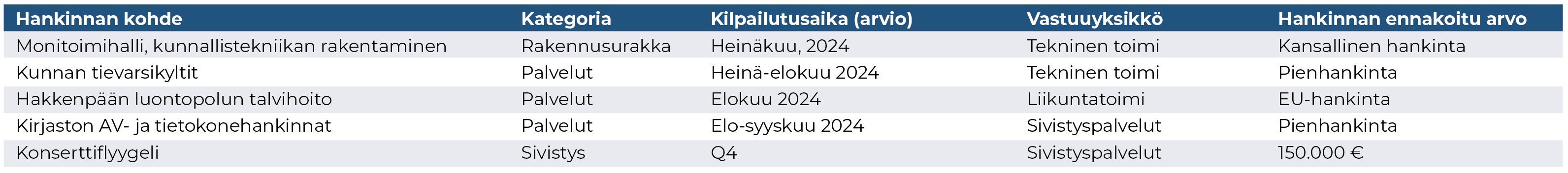 Tässä toisessa mallissa hankintakohdetta klikkaamalla avautuu oma sivu (kokeile, klikkaa taulukkoa). Hankkeen oma sivu luodaan vastaavasti kuin esim. Ajankohtainen tiedote lomakepohjalla, hankintakalenteriin tulostuu siitä valitut tiedot ja tarkempi hankintakuvaus omalla sivulla.